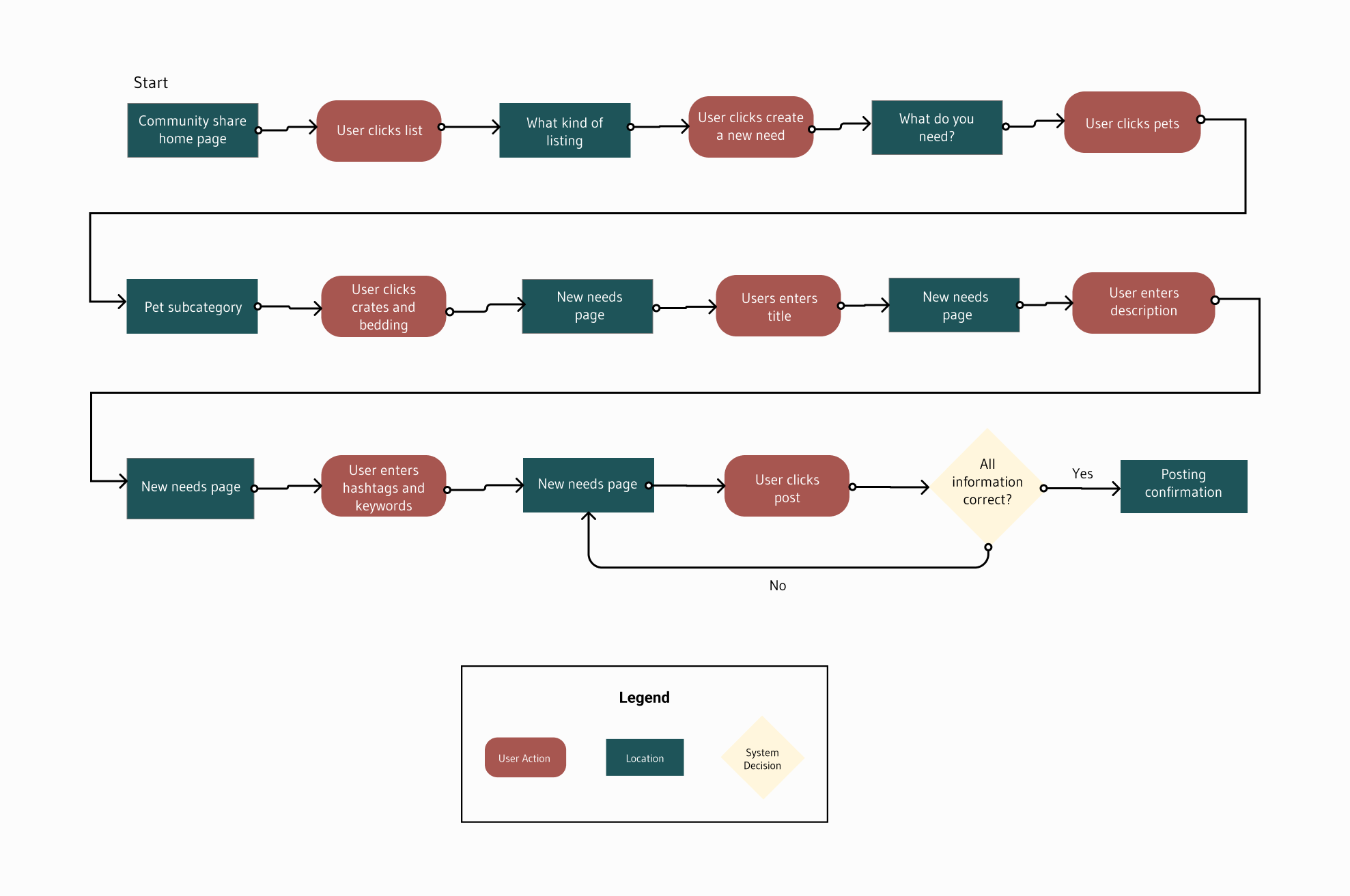 Using the user stories above I decided to focus on the key epic of finding a used item. In this task flow the user is creating creating a need in the app for a for dog crate. This task flow helps me to understand how the user would complete the task with the support of my digital product.