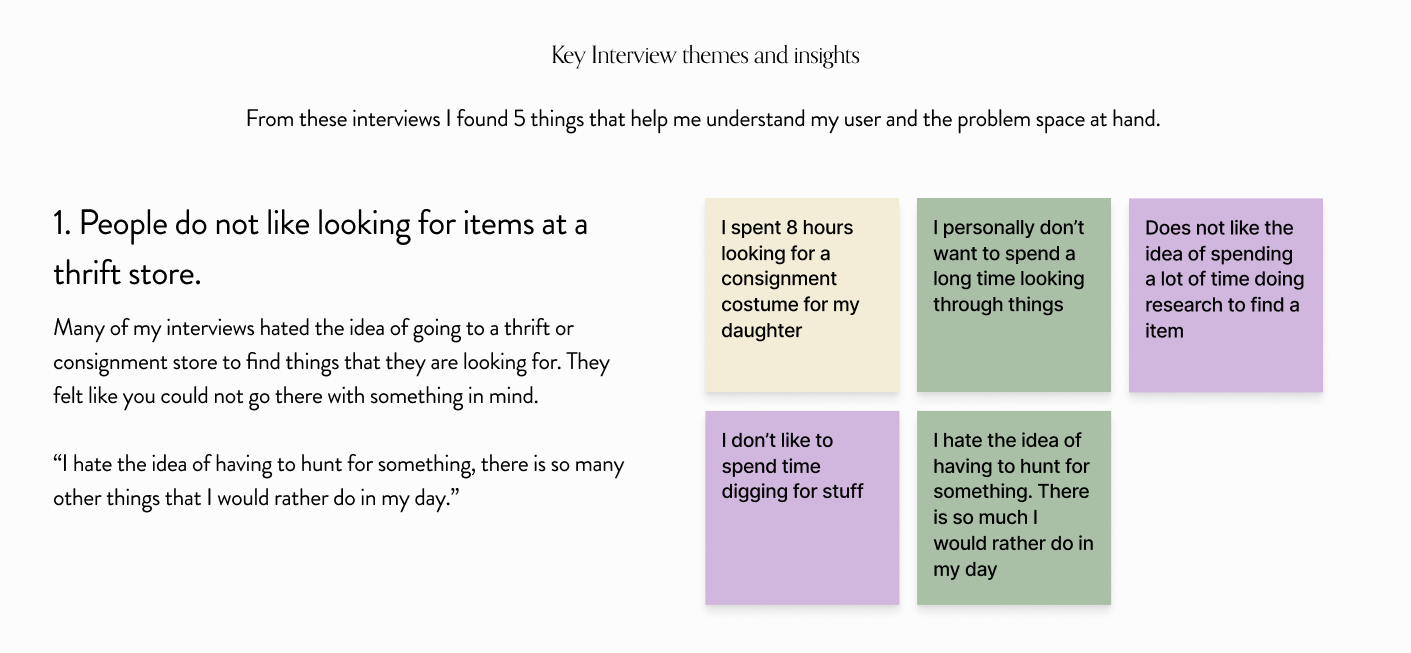 Based on these interviews I came to the conclusion that people like to donate and help others, but are less inclined to get things second hand as there are inventory problems at thrift stores. People often do not have close relationships with neighbors, so actively sharing personal goods seems like an overwhelming task. Therefore, I decided that I wanted to focus on finding a way to make it easier for people to utilize second hand options instead of participating in consumer culture.