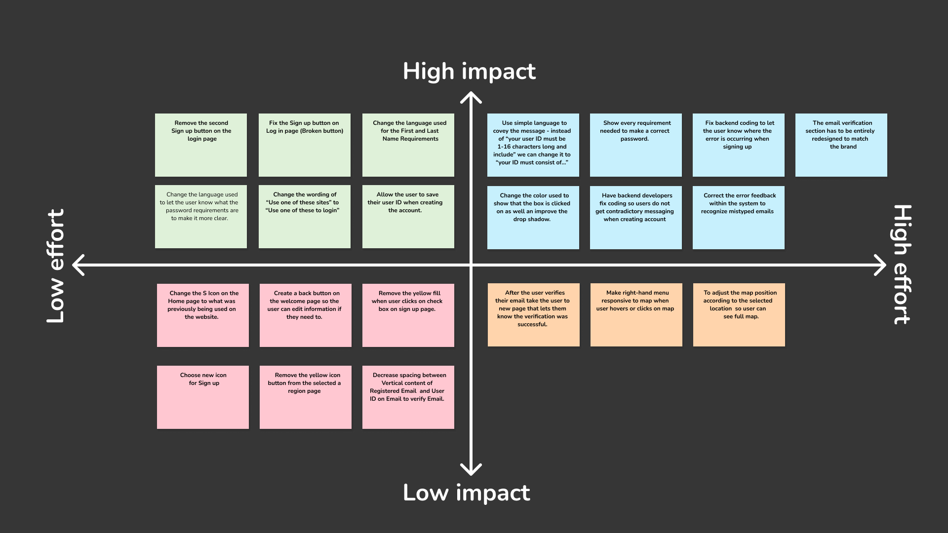With our opportunities for improvement laid out, it was time to start redesigning! We decided to make the most impactful changes first and then made our way through the matrix. Overall these usability issues ranked from minor cosmetic problems to major usability problems.