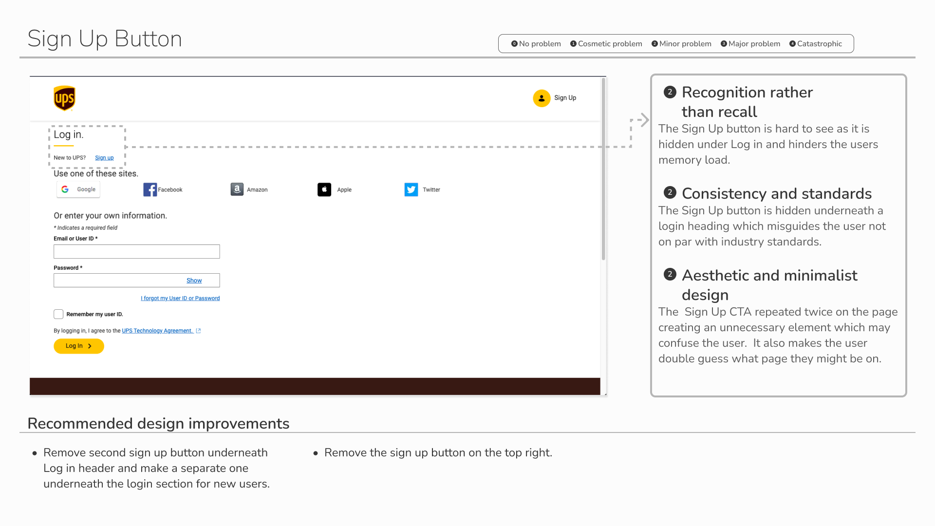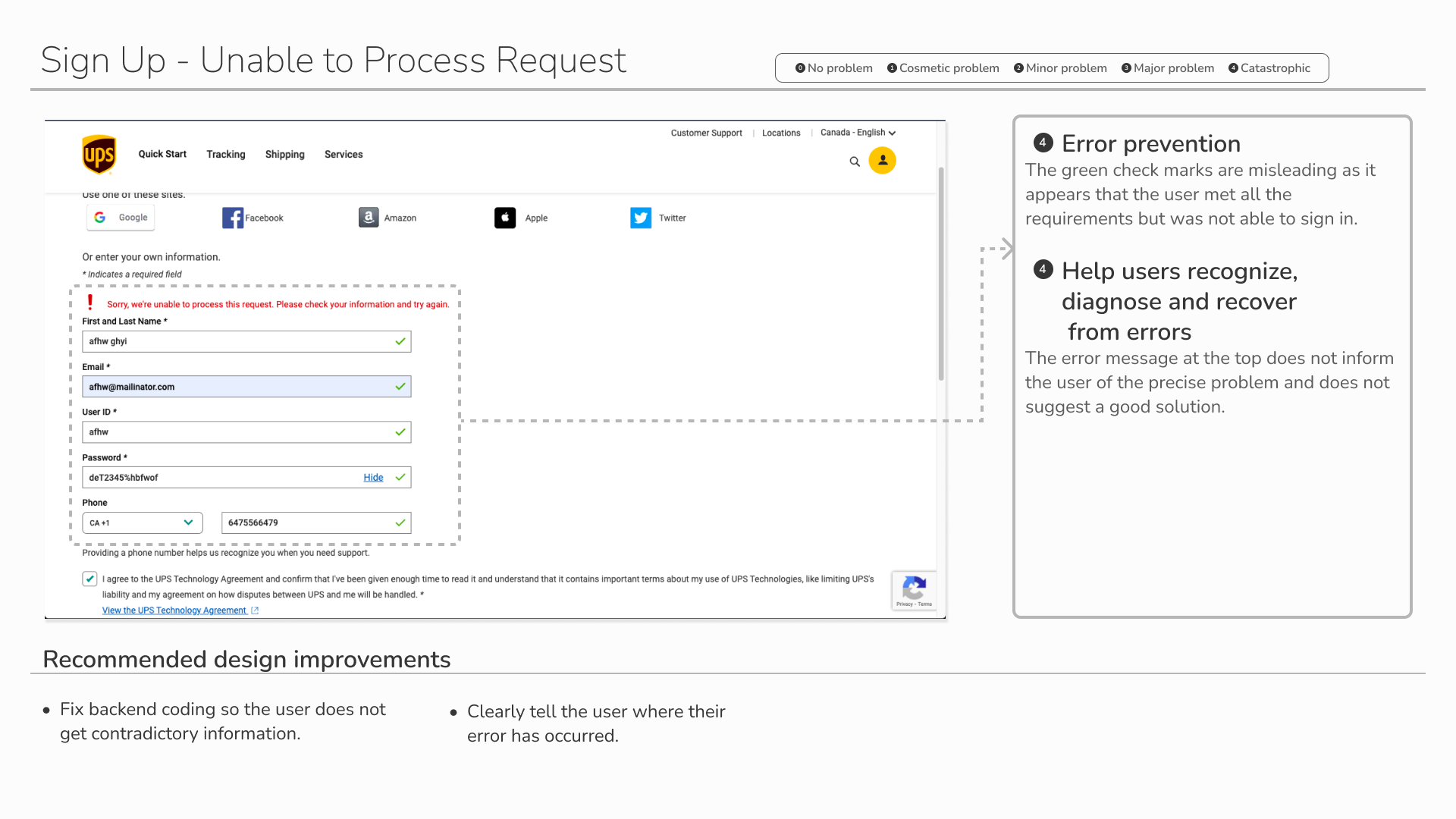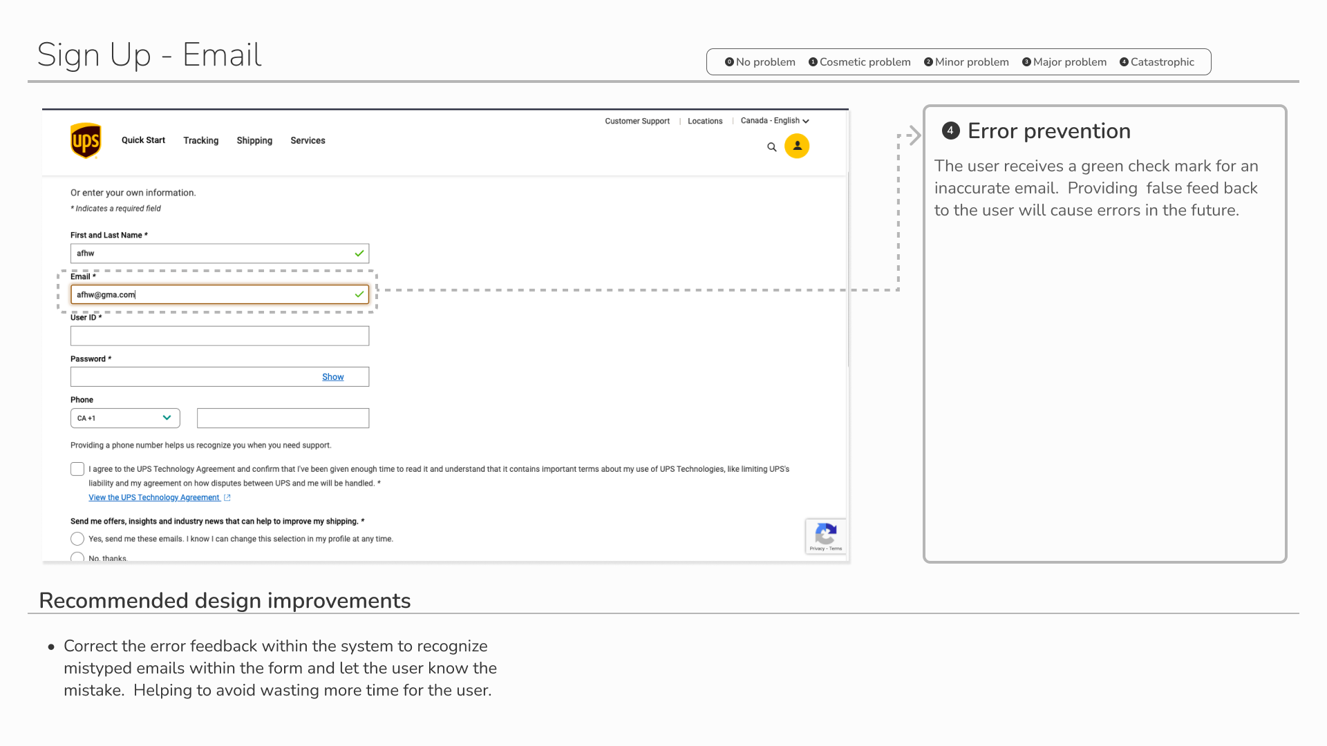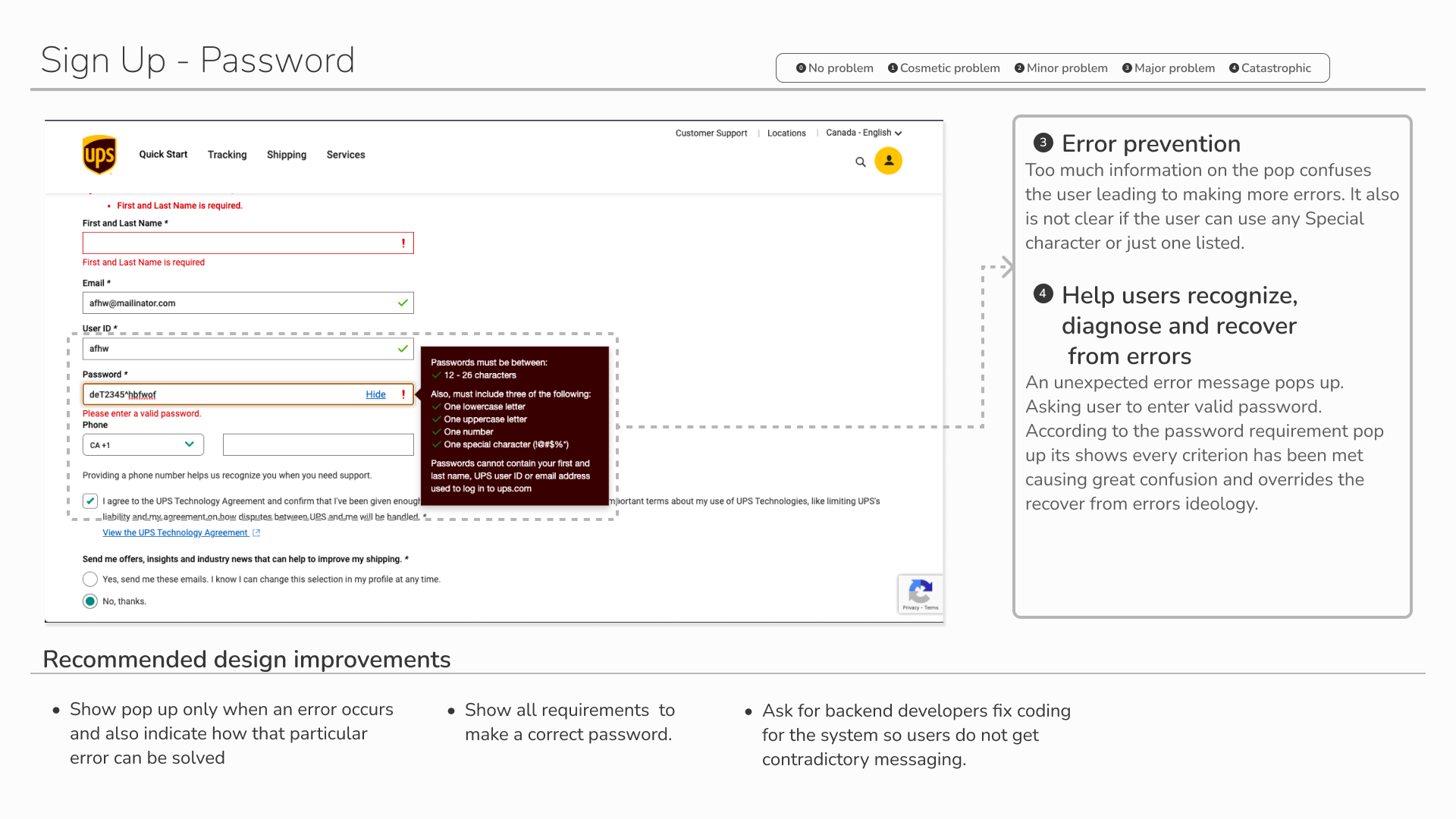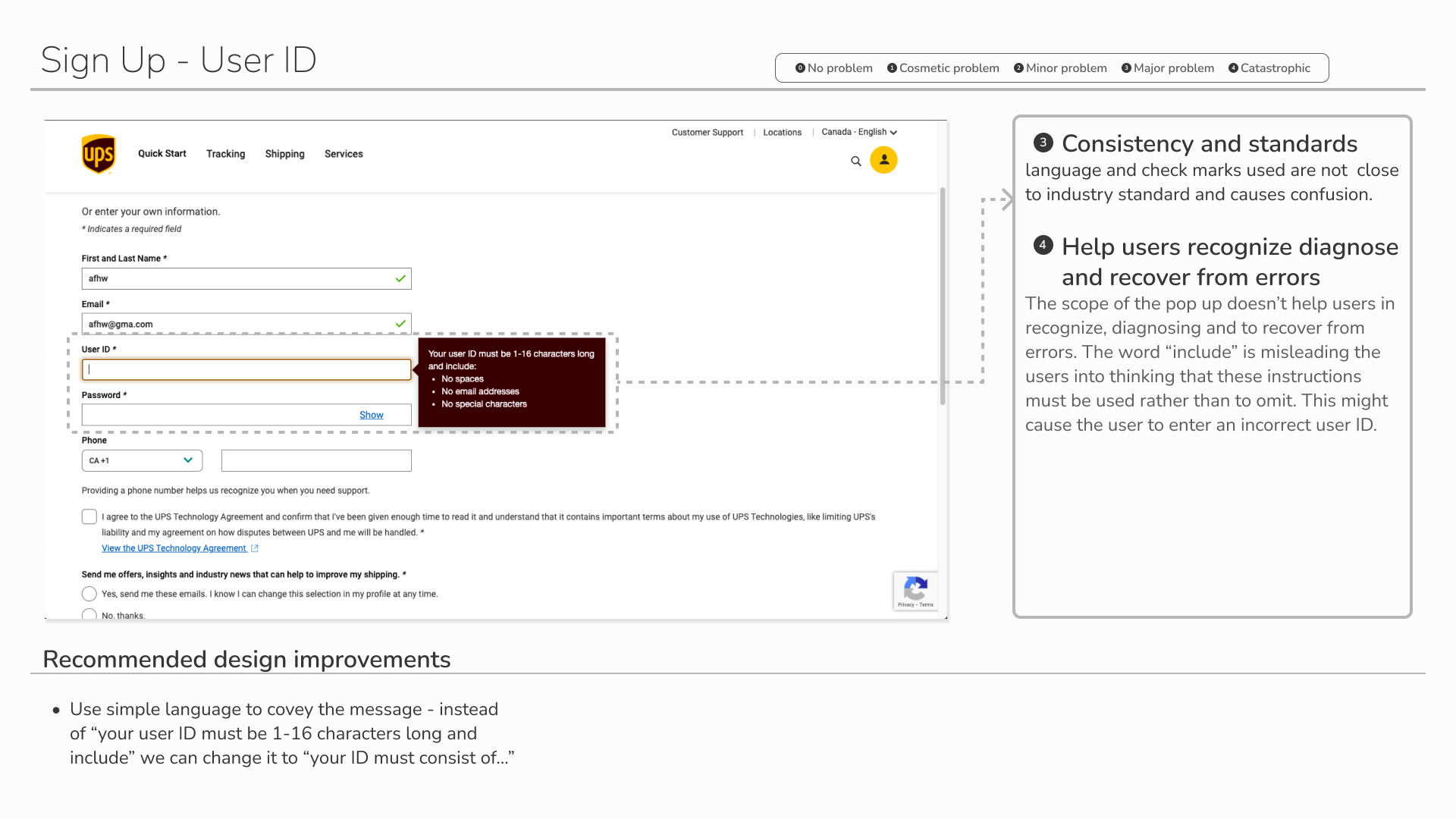 Using the Nielsen Norman Groups 10 Usability Heuristics, We found many problems during the experience of signing up on UPS’s website. These were the top 5 Violations: